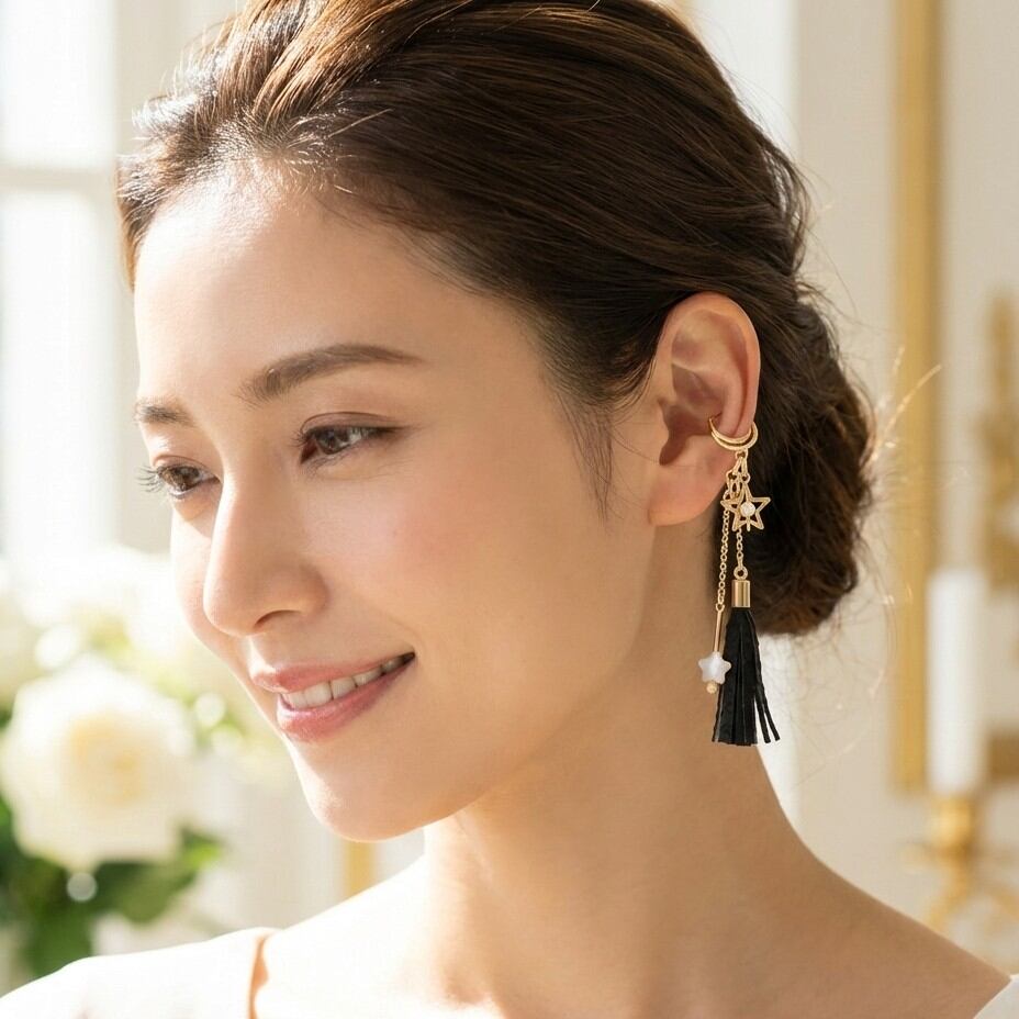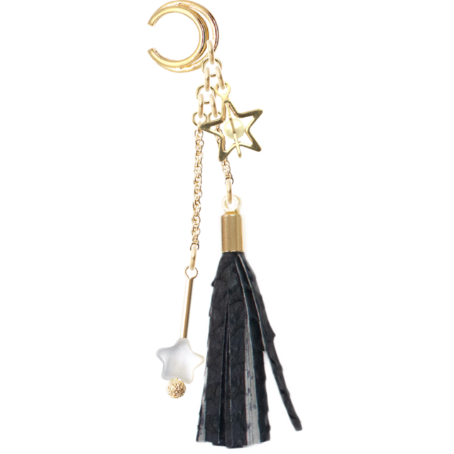 柔らかなブラックのフィッシュレザーを使ったイヤーカフに、愛らしい星型チャームと流れるようなタッセルが施されています。コントラストのあるデザインが耳元を引き立て、個性的でありながらシックな印象を与えるアイテムとなっています。このイヤーカフは、カジュアルな日常使いはもちろん、特別な日のおしゃれにも大活躍することでしょう。