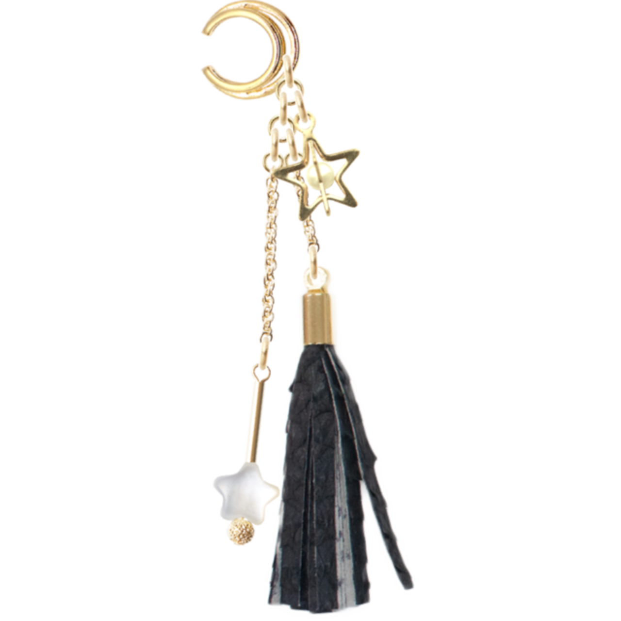 ・ブラックのフィッシュレザーとタッセル、星型チャームの組み合わせは、シンプルでありながら存在感があり、様々なシーンに合わせてお楽しみいただけるデザインです。