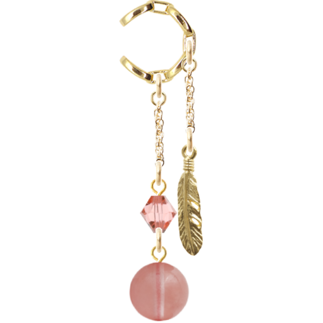 耳元を彩る魅力的なイヤーカフチェーンデザイン 天然石チェリークォーツ10mm スワロフスキー 羽根チャームをお届けします!