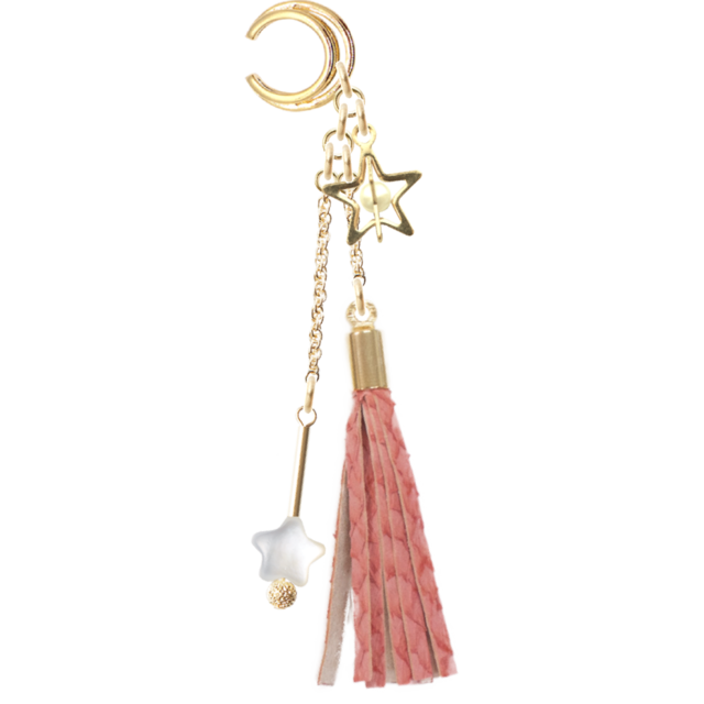 柔らかなピンク色のフィッシュレザーを使用したイヤーカフに、愛らしい星型チャームとタッセルが施されています。愛らしいデザインが顔周りを華やかに彩り、個性的で魅力的な印象を与えるアイテムとなっています。このイヤーカフは、カジュアルな日常使いはもちろん、特別な日のおしゃれにも大活躍することでしょう。