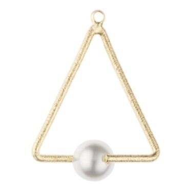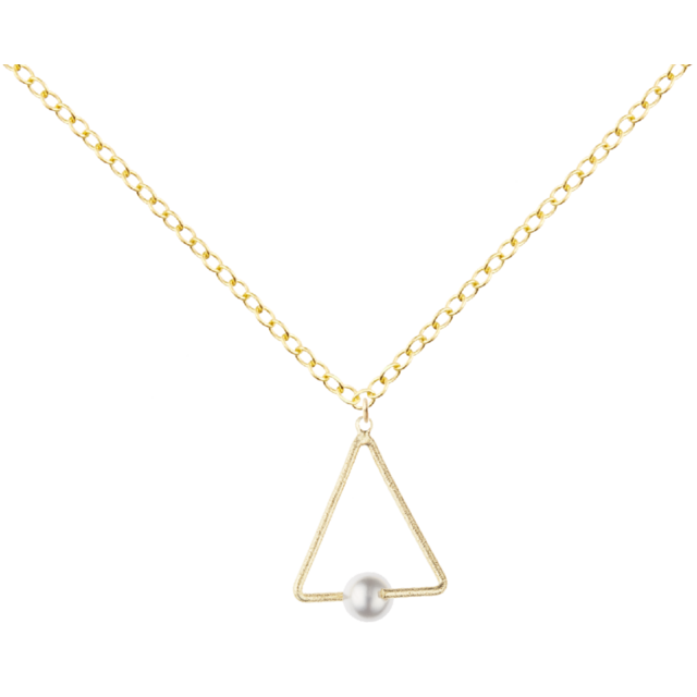 洗練されたデザインのトライアングルバチカンに美しい樹脂パールを組み合わせた、特別なあなたのためのネックレスです。梨地加工が施されたバチカンに樹脂パールが挟み込まれた立体的なパーツです。