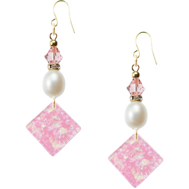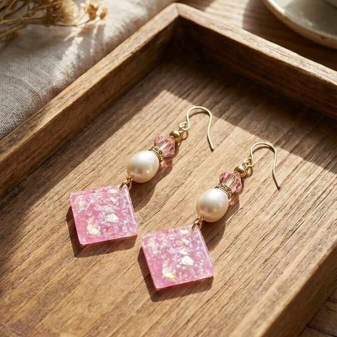 ピアス☆No1 ピンク ビーズ パール 四角 かわいい系