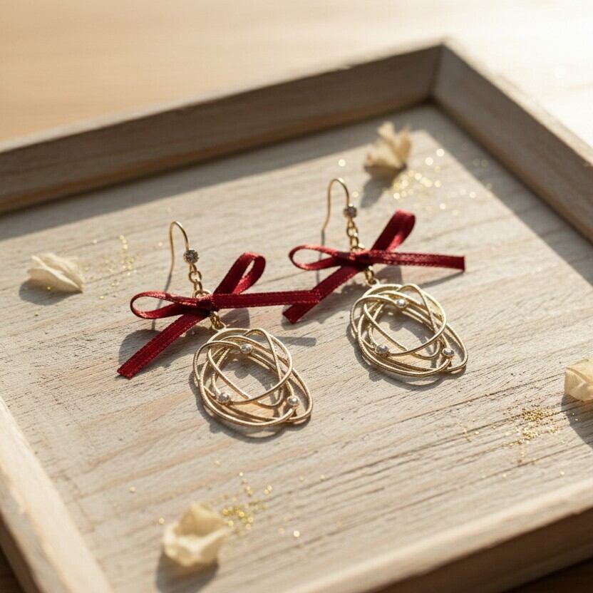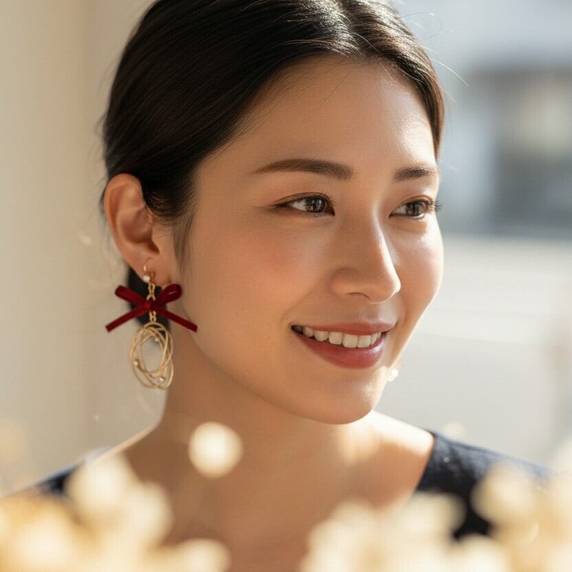 ・鮮やかなレッドカラーは、さまざまなコーディネートに鮮烈なアクセントを加え、周囲の視線を集めます。サテンの質感とラインストーンの輝きが、耳元をお洒落に彩ります。