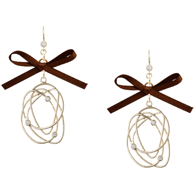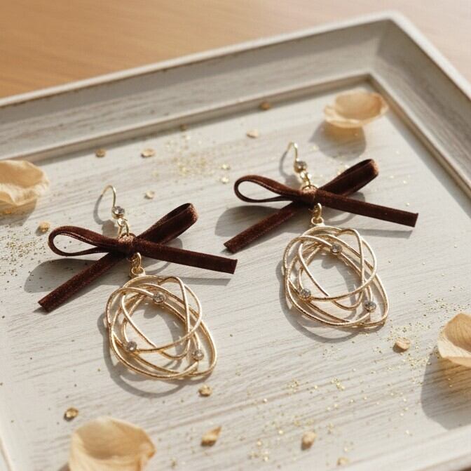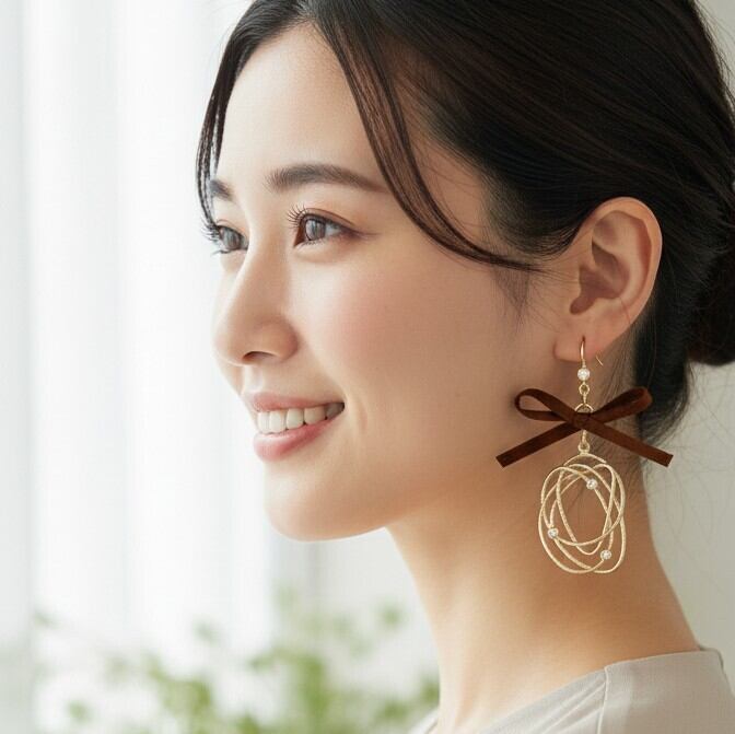 ・あたたかみのあるブラウンカラーは、さまざまなコーディネートに自然に馴染み、かわいらしさを演出します。サテンの質感とラインストーンの輝きが、耳元をおしゃれに彩ります。