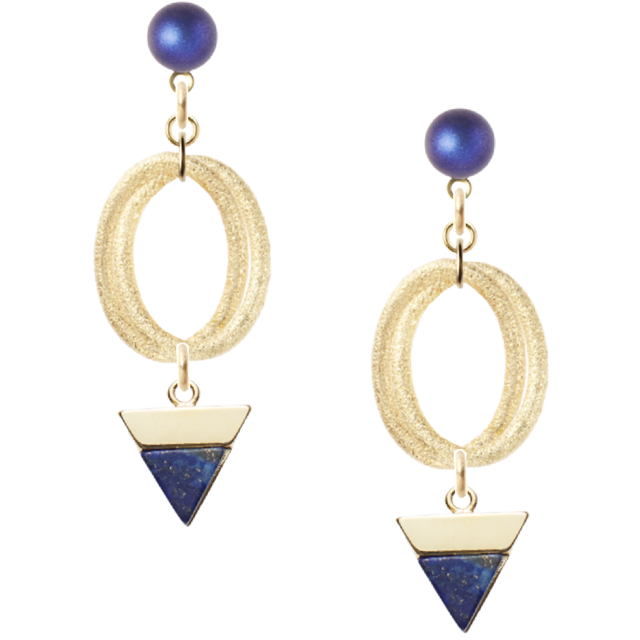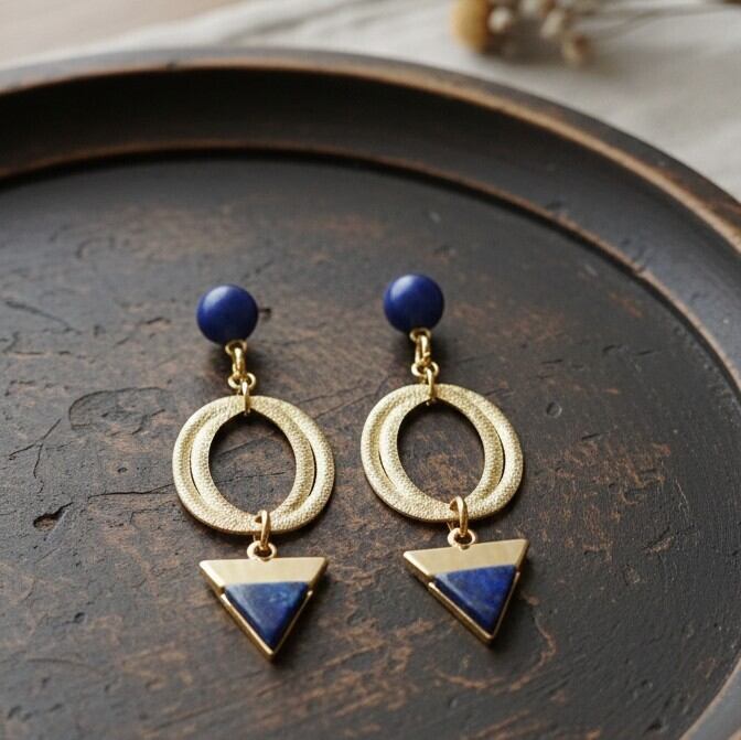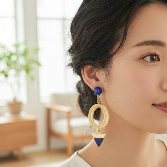 ・魅惑的なダークブルーは、さまざまなコーディネートにマッチし、大人の洗練を演出します。逆トライアングルのデザインが耳元をおしゃれに彩ります。