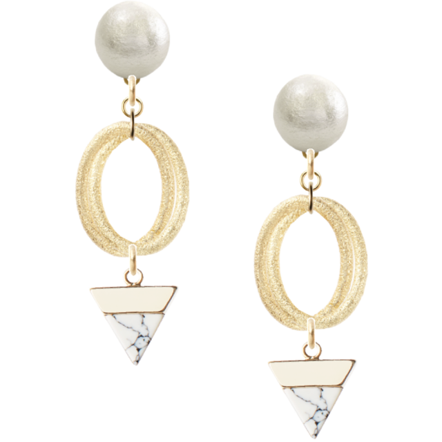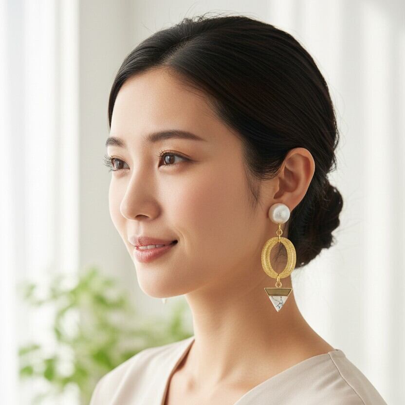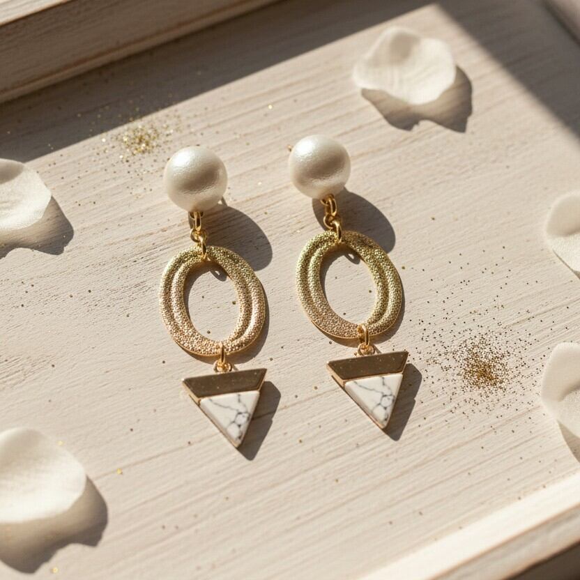 ・洗練されたホワイトパールは、さまざまなコーディネートに溶け込み、優雅さを演出します。逆トライアングルのデザインが、耳元をおしゃれに彩ります。