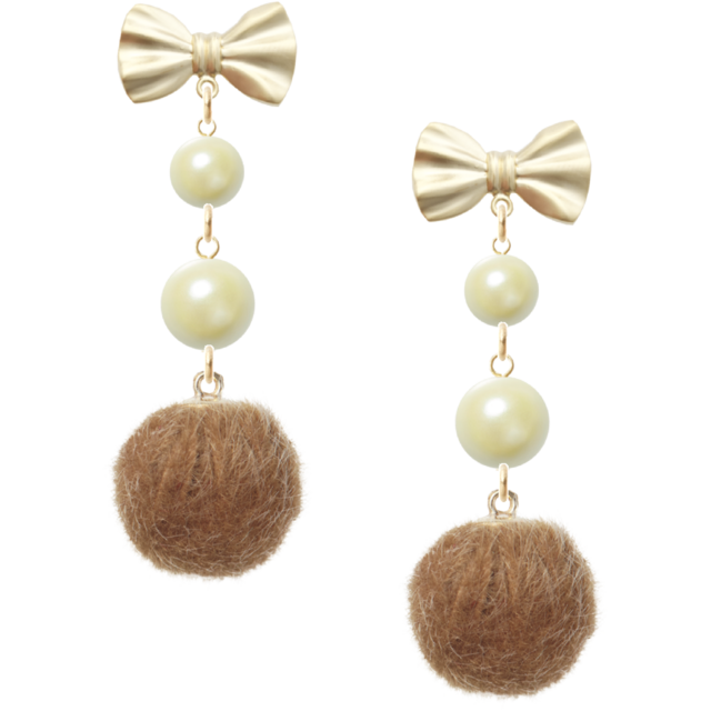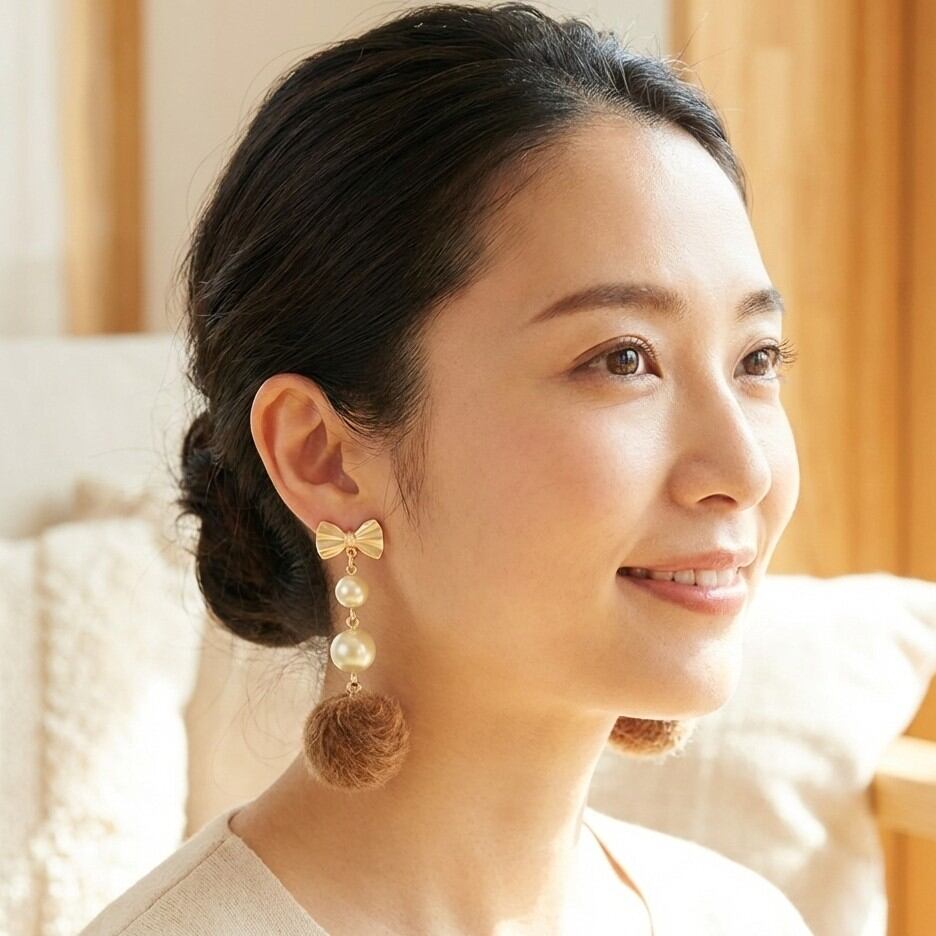 魅力的で洗練されたリボンピアス クリームパール ベージュファーボールをお届けします。