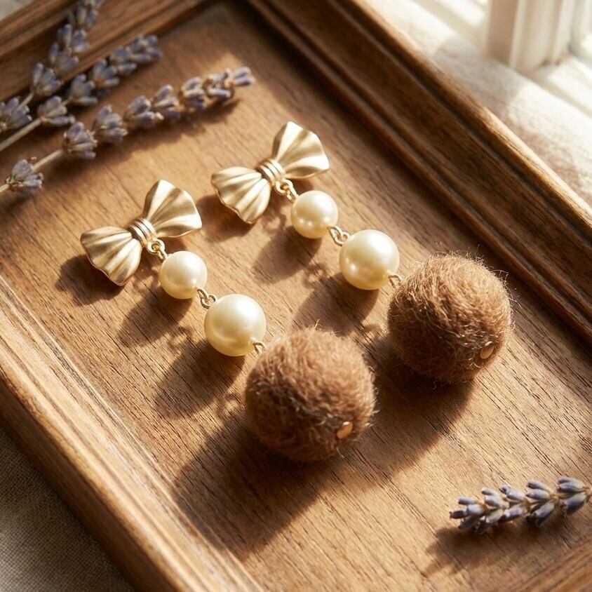 ・優しいクリームの色合いは、どんなコーディネートにも自然に溶け込み、あなたの魅力を引き立てます。リボンデザインが耳元に繊細でかわいらしい印象を与え、特別な日を華やかに演出します。