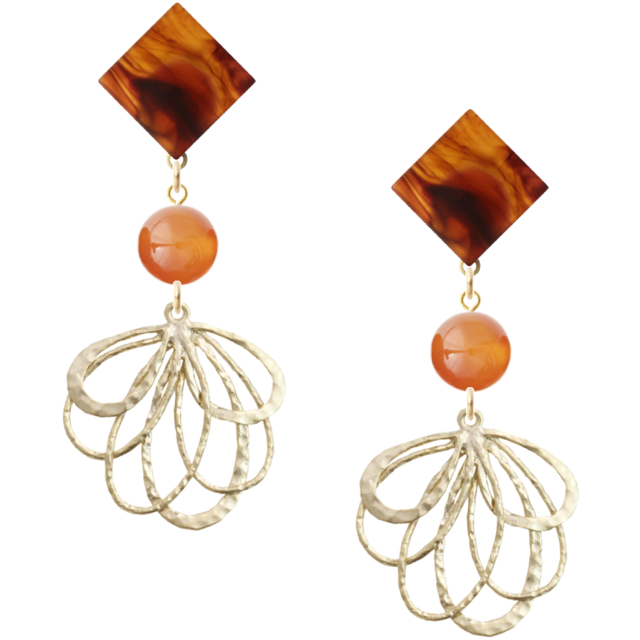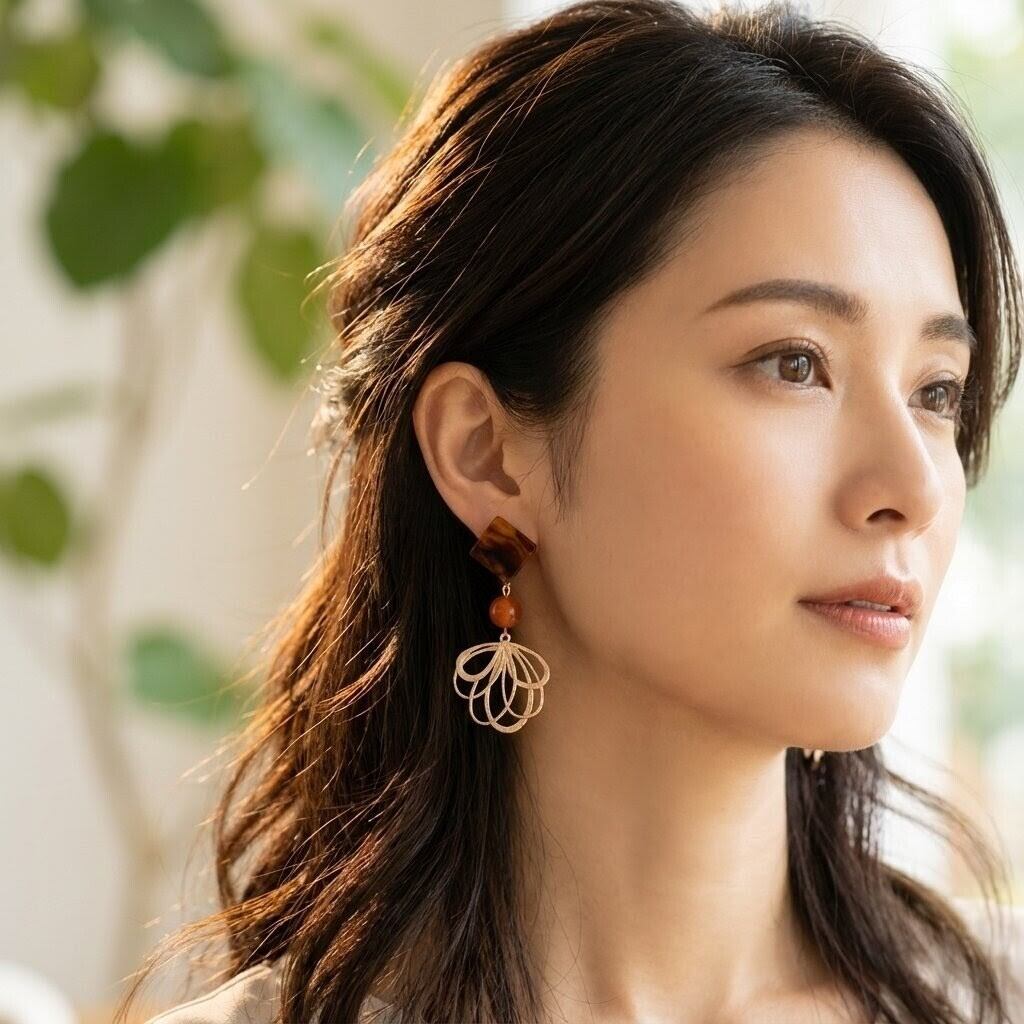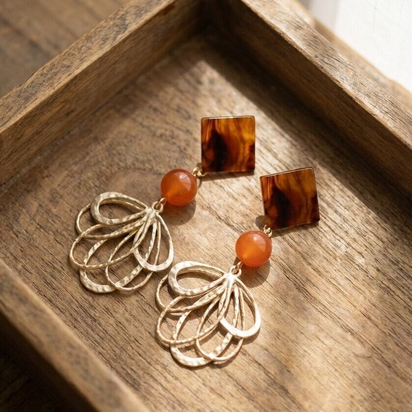 ・優雅なべっこうのトーンとカーネリアンの鮮やかな色合いは、どんなコーディネートにも調和し、あなたの魅力を引き立てます。スクエアデザインのモダンな印象が耳元に洗練された雰囲気を与え、特別な日の装いを華やかに演出します。