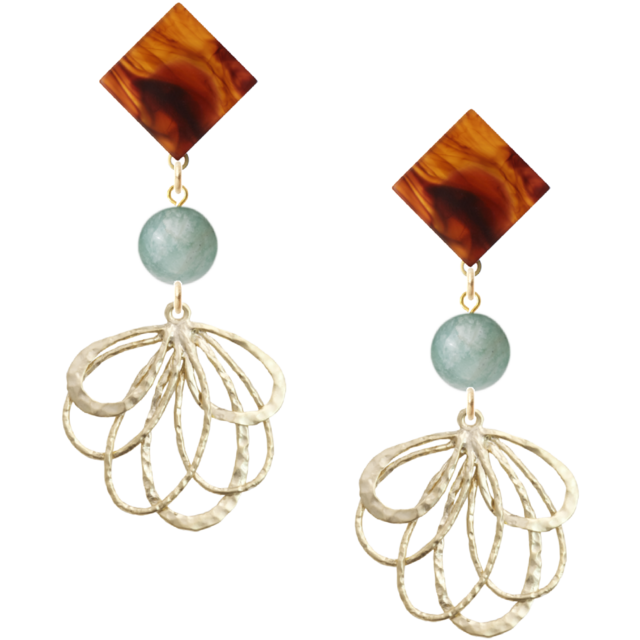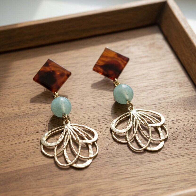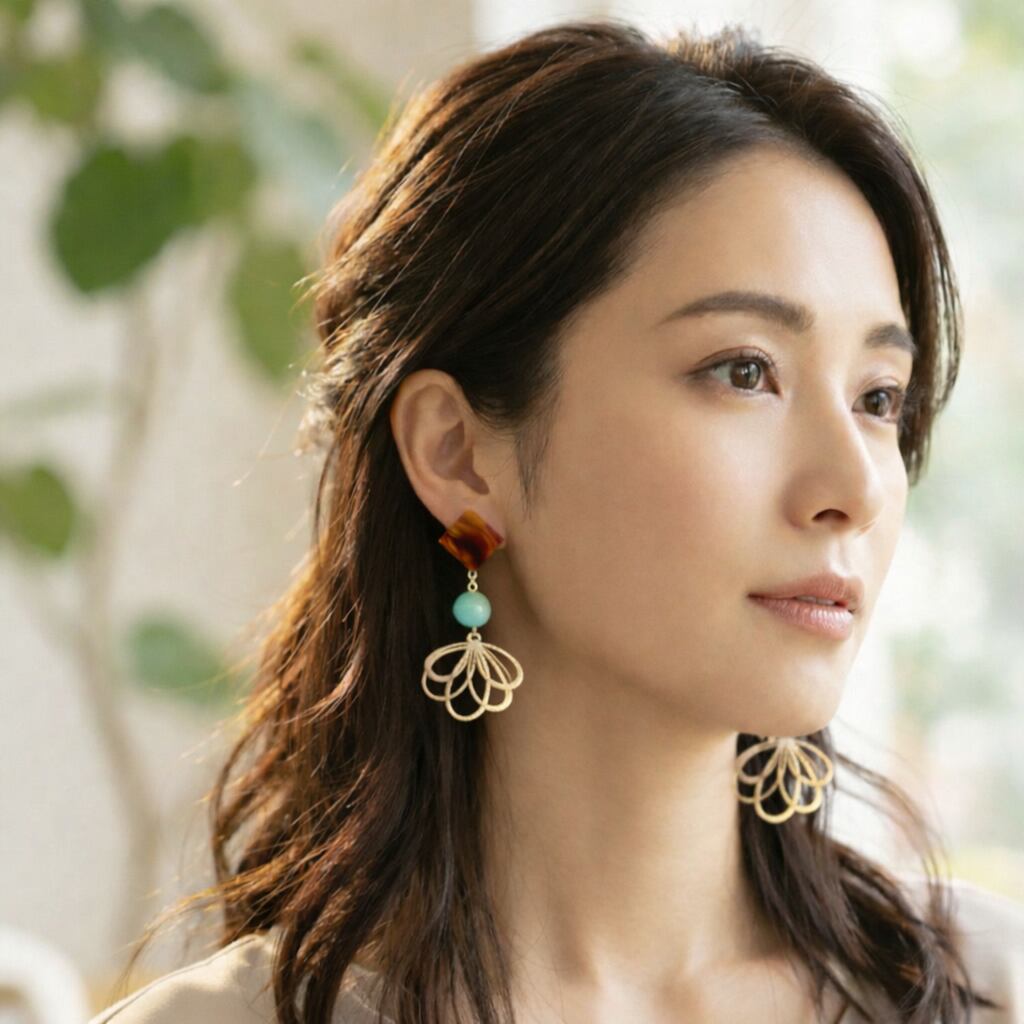 ・リッチなべっこうのトーンとアマゾナイトの優しい色合いは、どんなコーディネートにも調和し、あなたの魅力を引き立てます。スクエアデザインが耳元に洗練された雰囲気を与え、特別な日の装いを華やかに演出します。