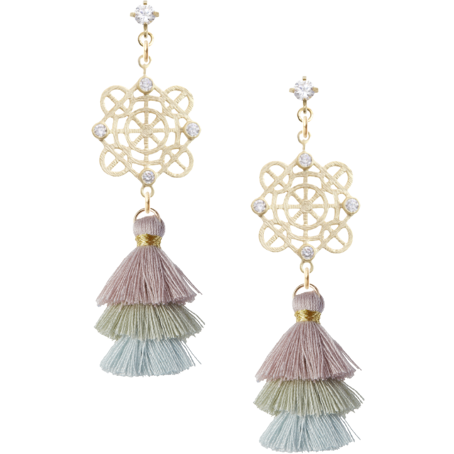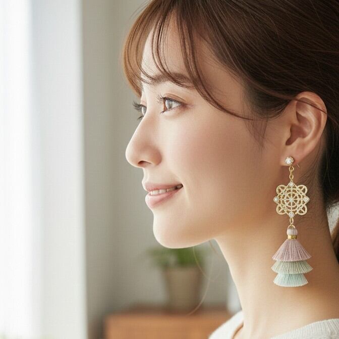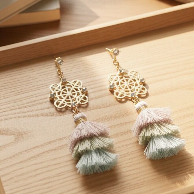 ゴールドの輝きとラインストーンの煌めきが、あなたのスタイルを一層引き立て、タッセルの柔らかな揺れが動きのある印象を与えます。また、軽やかな着け心地にもこだわり、長時間の使用でも快適にお楽しみいただけます。