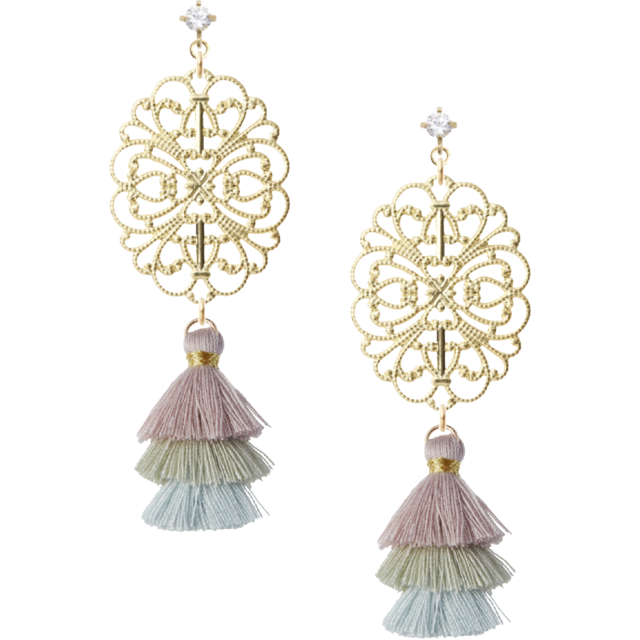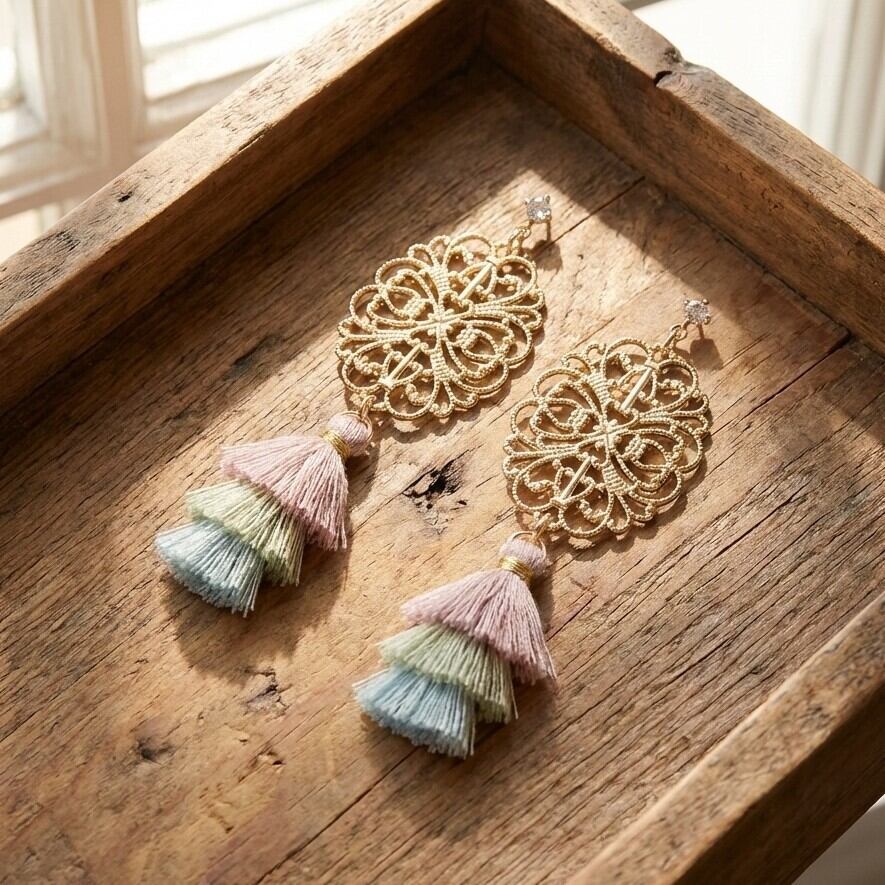 ゴールドの輝きとすかしデザインが、あなたのスタイルにエレガントさを加え、タッセルの柔らかな揺れが動きのある印象を与えます。また、軽やかな着け心地にこだわり、長時間の使用でも快適にお楽しみいただけます。