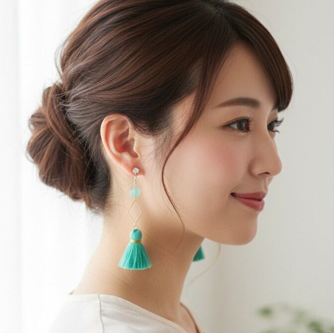 ・エレガントなミントグリーンとラインストーンの輝きは、特別な日の装いを一層引き立て、普段使いにもぴったりです。ひし形のデザインが顔周りを華やかに演出し、全体のスタイルを格上げします。