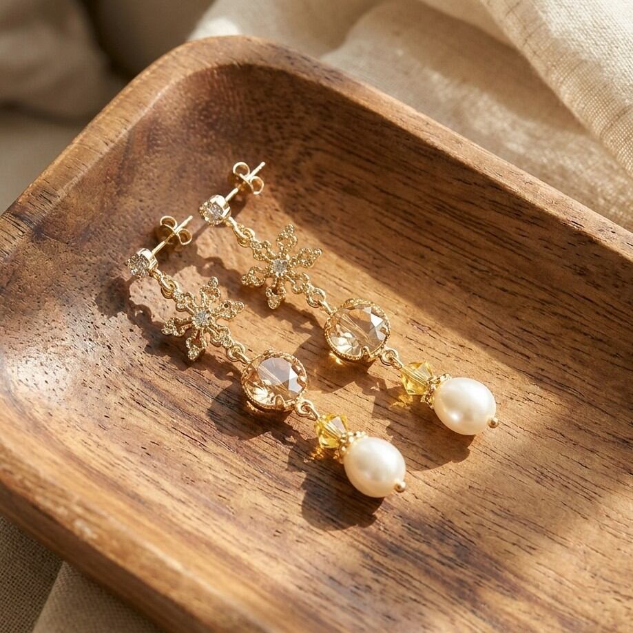 ・エレガントなクリスタルゴールデンシャドウと淡水パールのコンビネーションは、特別な日の装いを一層引き立て、普段使いにもぴったりです。透かしデザインが顔周りを華やかに演出し、全体のスタイルを格上げします。
