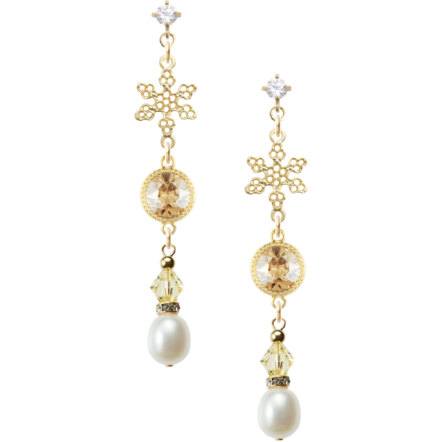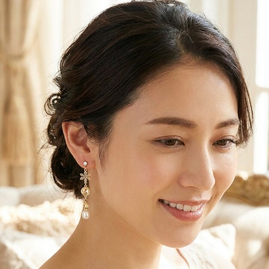 美しいラウンドスワロフスキーの輝きが、スノー透かしのデザインや淡水パールホワイトと組み合わさり、あなたのスタイルに清楚な印象を与え、どんなシーンでも存在感を放ちます。さらに、軽やかな着け心地にこだわり、長時間でも快適にお楽しみいただけます。