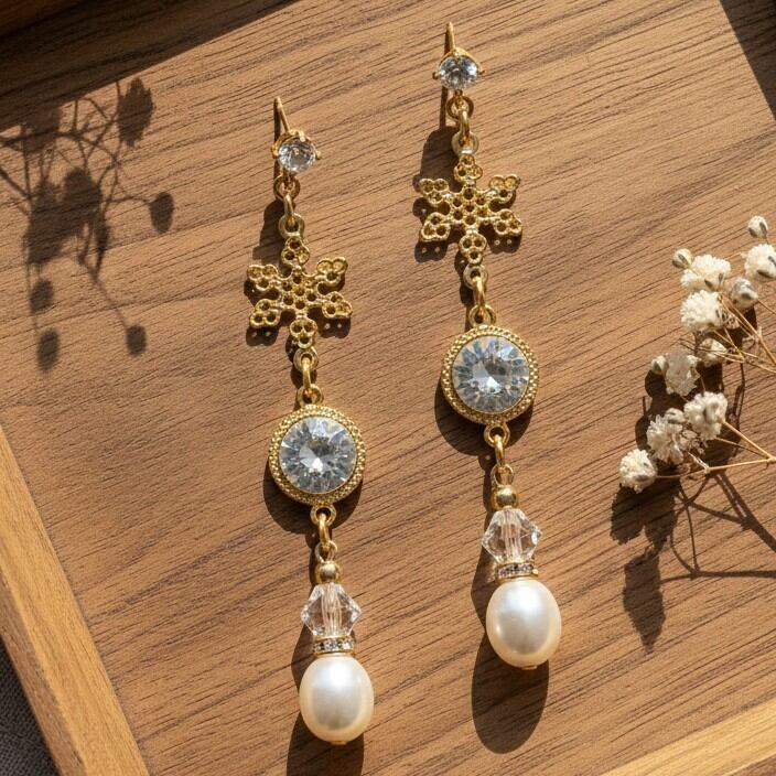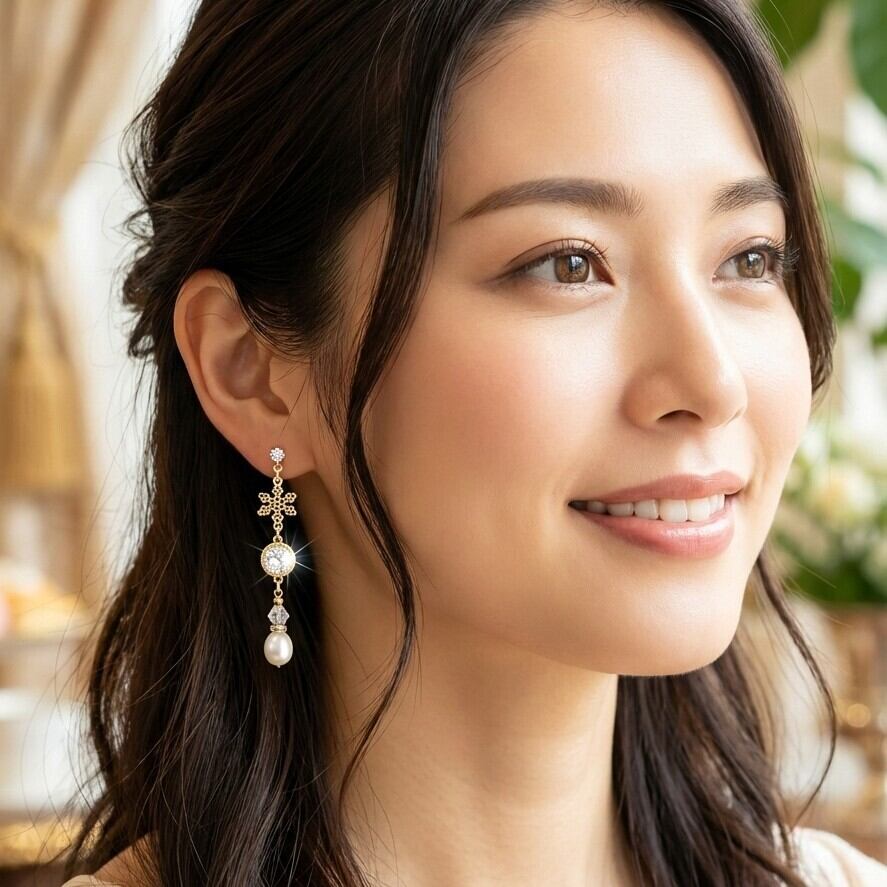美しいラウンドスワロフスキーの輝きが、スノー透かしのデザインや淡水パールホワイトと組み合わさり、あなたのスタイルに清楚な印象を与え、どんなシーンでも存在感を放ちます。さらに、軽やかな着け心地にこだわり、長時間でも快適にお楽しみいただけます。