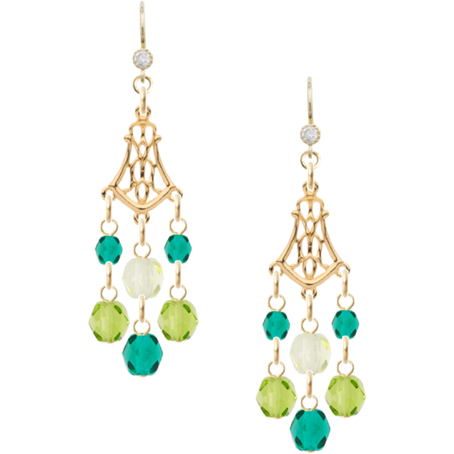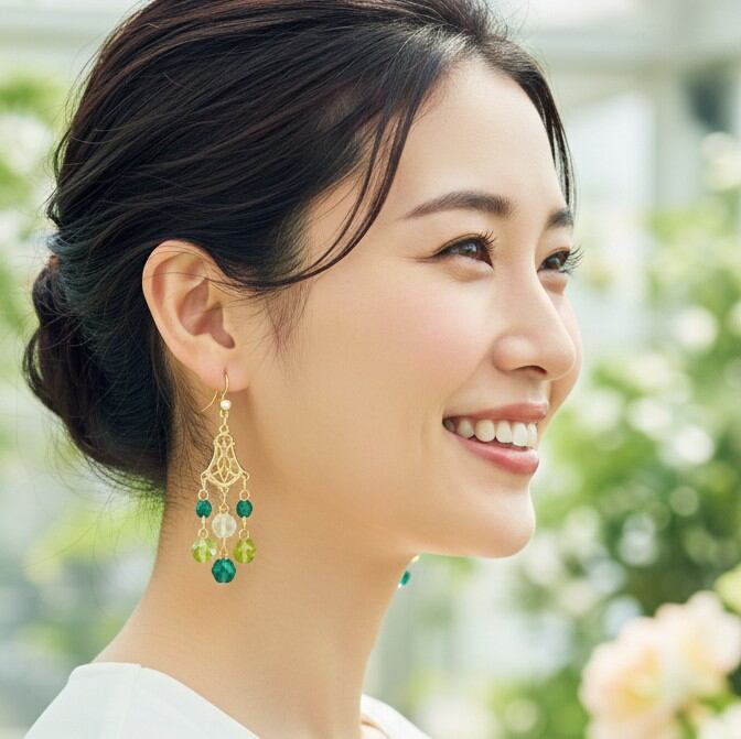 ・透明感のある一粒ラインストーンと透かしチャーム、チェコビーズエメラルドを組み合わせたデザインは、特別な日の装いを引き立てながら、日常使いにもピッタリです。バランスの良いデザインが大人の雰囲気を醸し出し、洗練されたスタイルを実現しています。