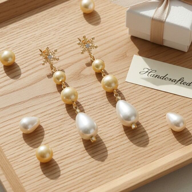 このアイテムは、柔らかな8mmと10mmのコットンパールライトベージュに、繊細な雪の結晶デザインとユリア樹脂の変形パールナゲットが美しく組み合わさった特徴的なデザインが魅力です。特別な日や普段のスタイルに清楚でエレガントな印象を与えます。
