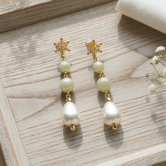 ピアス☆No68 雪の結晶ピアス コットンパールミントグリーン8mm 10mm ユリア樹脂変形パールナゲット 清楚系