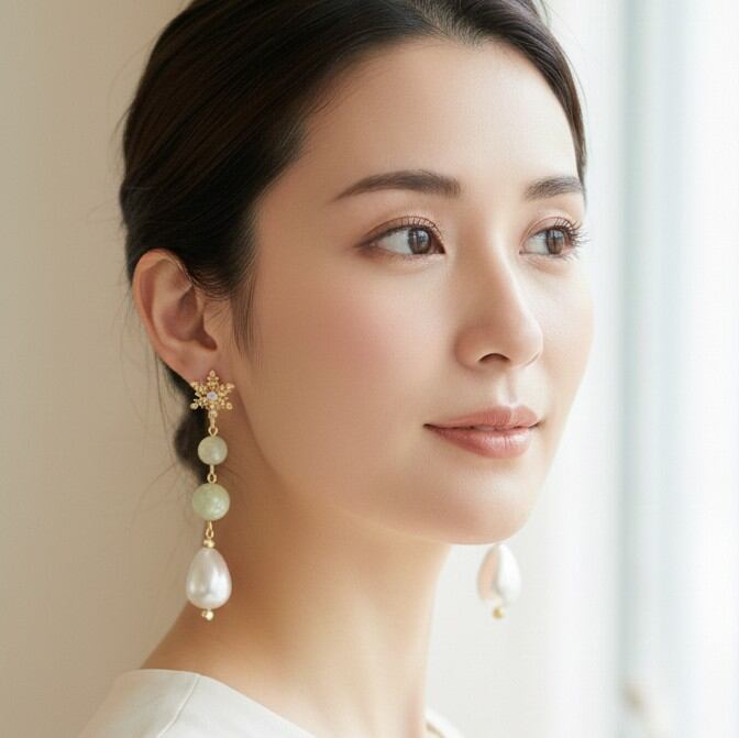 このアイテムは、穏やかなミントグリーンのコットンパールとユリア樹脂の変形パールナゲットが絶妙に組み合わさったデザインが特長です。特別な日や日常のスタイルに清楚で優雅な印象を与えます。