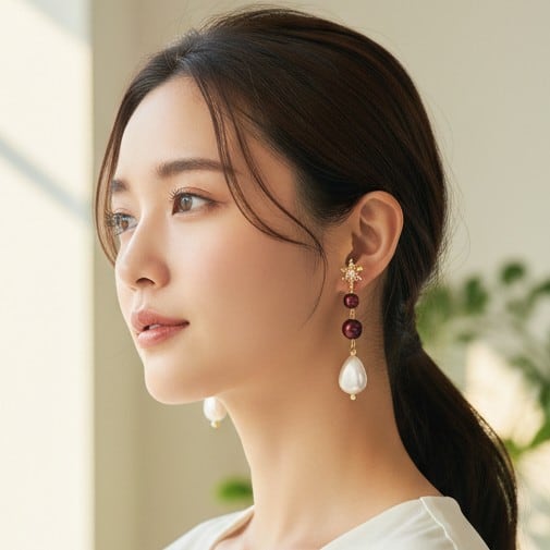 ・雪の結晶のデザインと樹脂パールアメリカンチェリーの8mm、10mm、ユリア樹脂変形パールナゲットの組み合わせは、特別な日の装いを引き立てつつ、日常使いにもぴったりです。絶妙なバランスが清楚な雰囲気を生み出し、女性らしい魅力を引き立てるスタイルに仕上がっています。