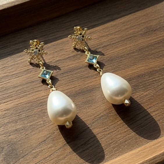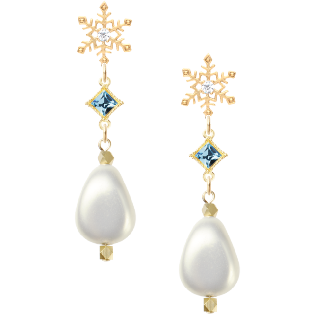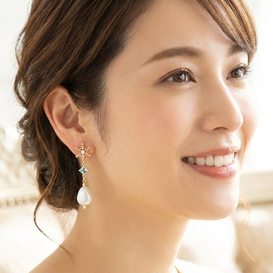 雪の結晶ピアス スワロフスキースクエアアクアマリン ユリア樹脂変形パールナゲット 清楚系をお届けします。