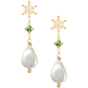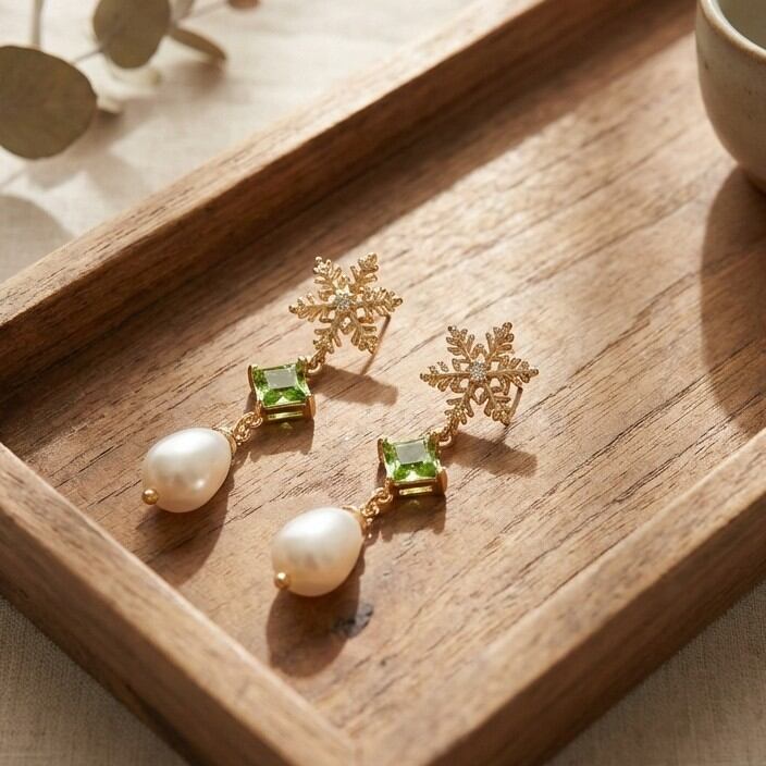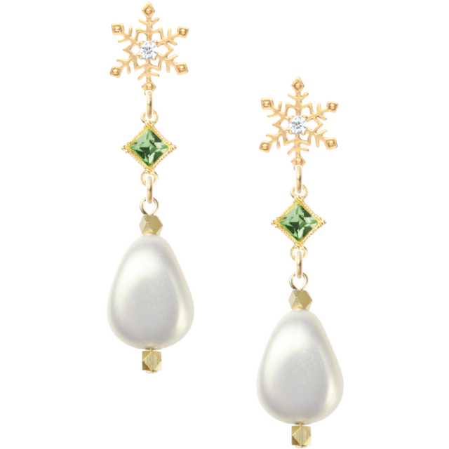 雪の結晶ピアス スワロフスキースクエアペリドット ユリア樹脂変形パールナゲット 清楚系をお届けします。