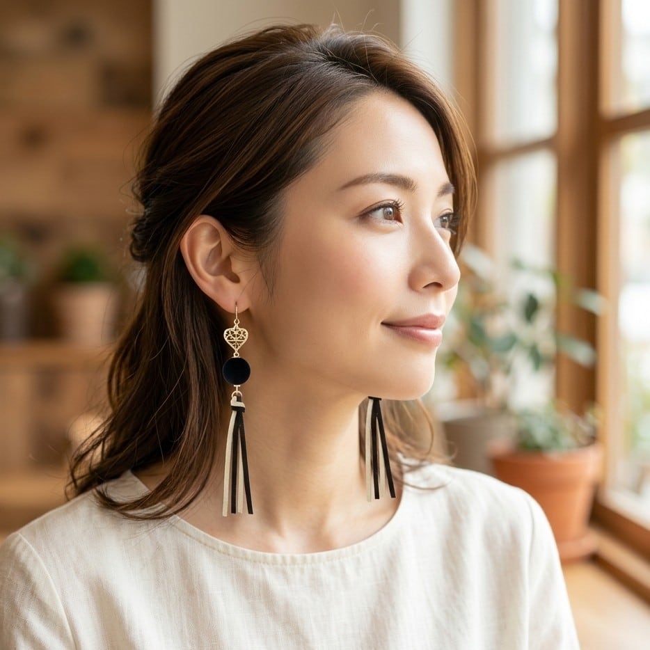 ・深みのあるブラックのベルベットボールと、ブラック✕ベージュのレザータッセルが美しく調和し、特別な日の装いを一層華やかに引き立てます。大人の女性にふさわしい洗練されたデザインで、どんなシーンにも柔軟に対応できる仕上がりです。
