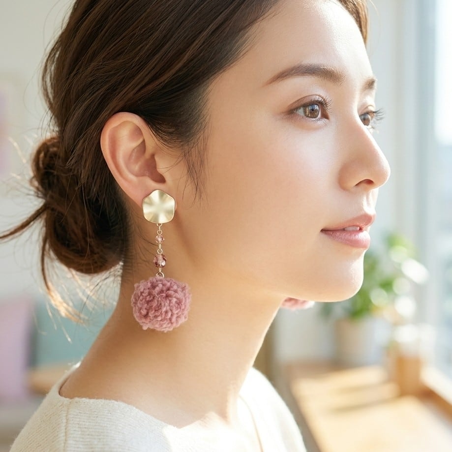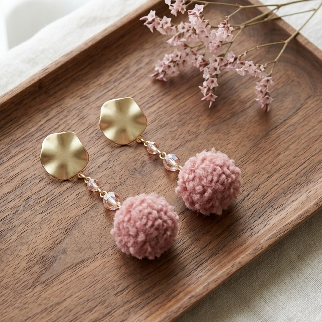 ・優しさ溢れるローズオーロラのチェコビーズ(4mm、6mm)と、ほんのりとしたピンクのプードルファーボールが絶妙に調和し、特別な日の装いを一層華やかに引き立てます。かわいい系のデザインに適したスタイルで、あらゆるシーンに柔軟に対応できる仕上がりです。