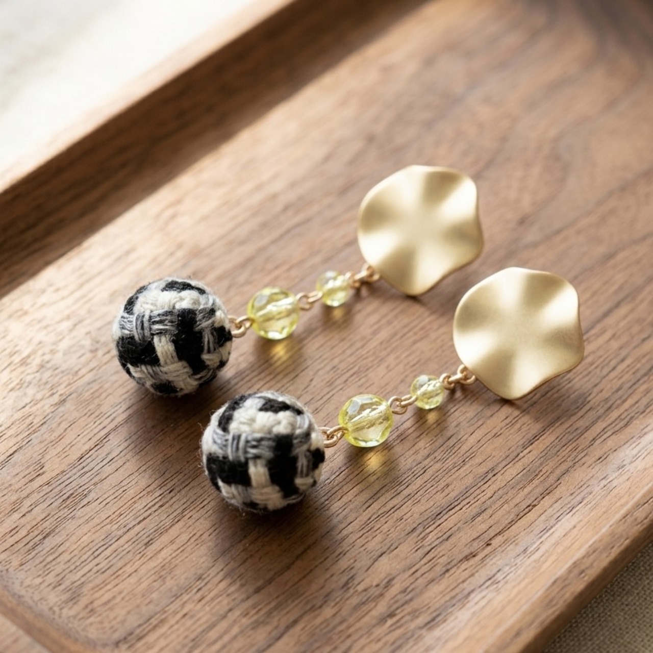 ・明るいジョンキルのチェコビーズ(4mm、6mm)と、洗練されたブラックのツイードボールチャームが見事に調和し、特別な日の装いを華やかに引き立てます。かわいい系のデザインに適したスタイルで、あらゆるシーンに柔軟に対応できる仕上がりです。