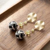 ピアス☆No139 変形ラウンドプレートピアス チェコビーズジョンキル4mm 6mm ツイードボールチャームブラック かわいい系