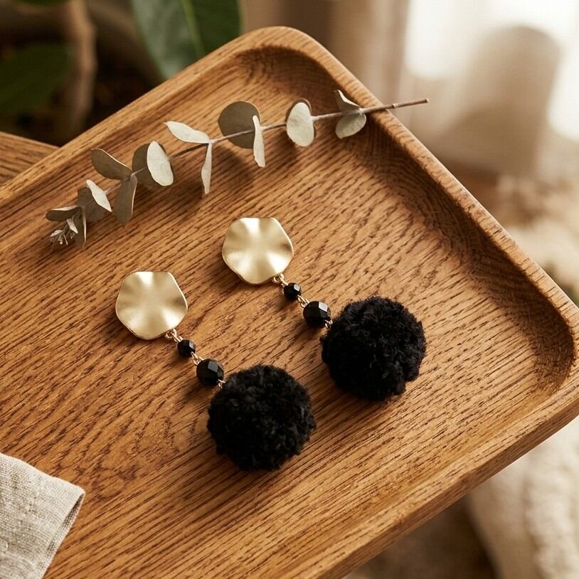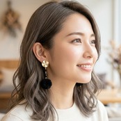 ・深みのあるジェットカラーのチェコビーズ(4mm、6mm)と、柔らかなブラックのプードルファーボールが美しく調和し、特別な日の装いを一層引き立てます。かわいい系のデザインに適したスタイルで、あらゆるシーンに柔軟に対応できる仕上がりです。