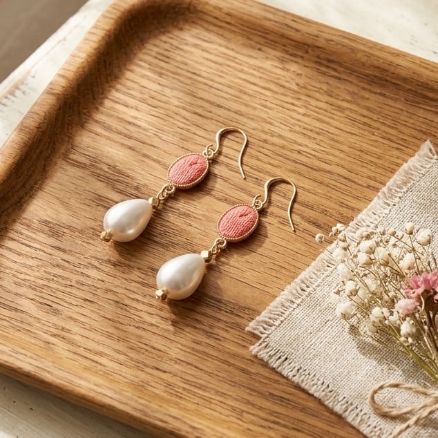 ・フィッシュレザーオーバルピンクとユリア樹脂の変形パールナゲットが絶妙に調和し、特別な装いにもカジュアルな日常にも柔軟に対応できるスタイルです。