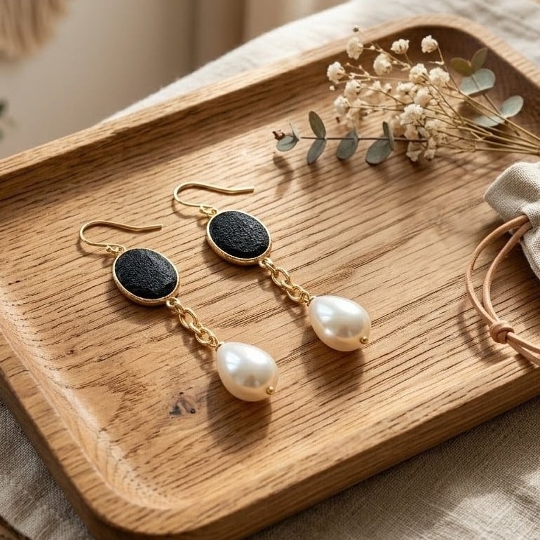 ・フィッシュレザーオーバルブラックとユリア樹脂の変形パールナゲットが絶妙に調和し、特別な日の装いにもカジュアルな日常にも柔軟に対応できるスタイルです。