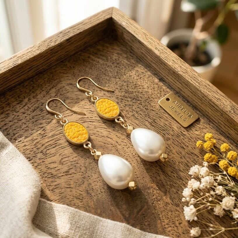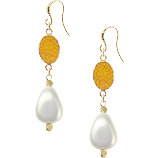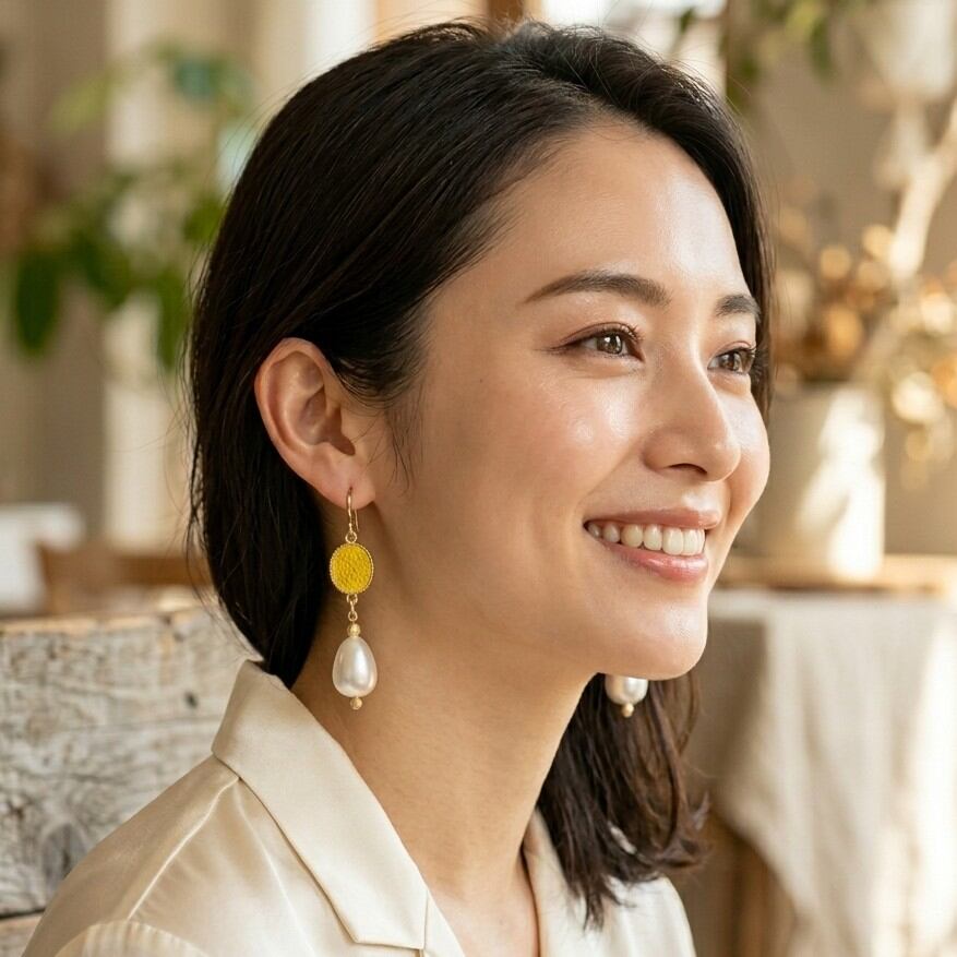 ・フィッシュレザーオーバルイエローとユリア樹脂の変形パールナゲットが見事に調和し、特別な装いにもカジュアルな日常にも柔軟に対応できるスタイルです。