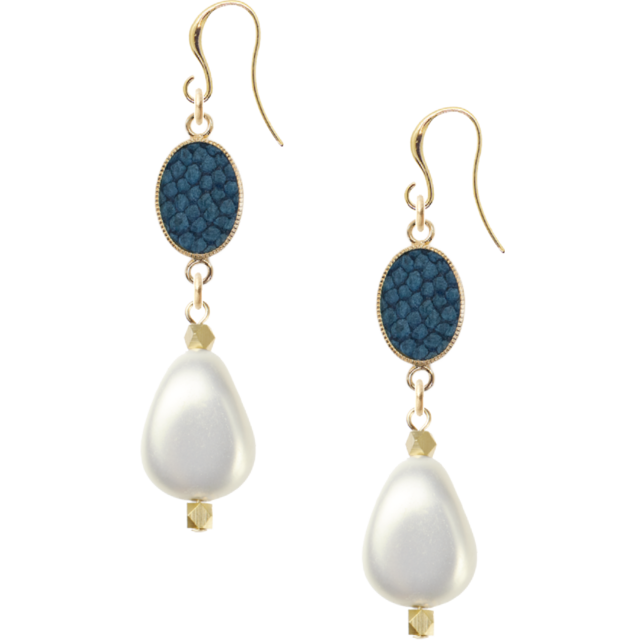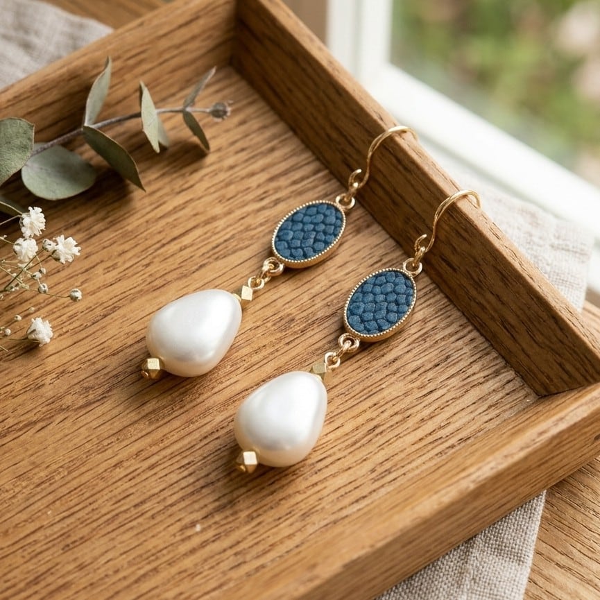 ・フィッシュレザーオーバルブルーとユリア樹脂の変形パールナゲットが美しく調和し、特別な装いだけでなくカジュアルな日常にも柔軟に対応するデザインです。