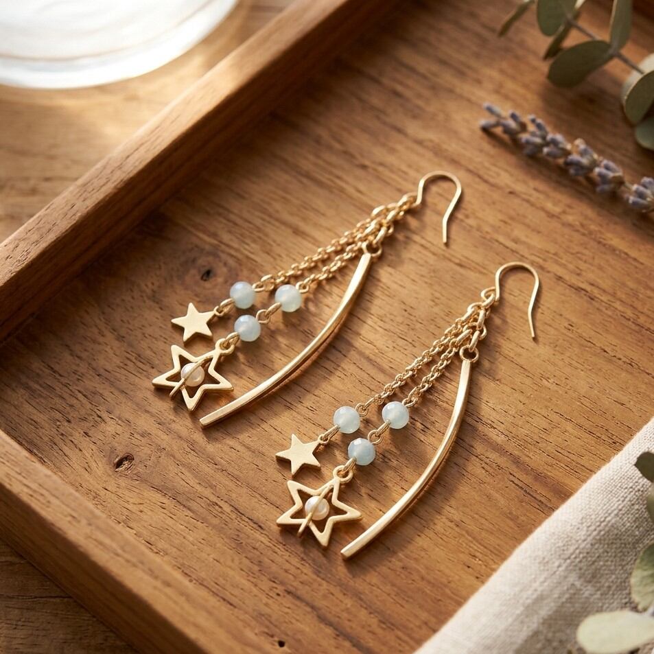 ・ミントグリーンのボタンカットガラスビーズと立体スターパールが美しく調和し、特別な装いにもカジュアルな日常にも合わせやすいデザインです。