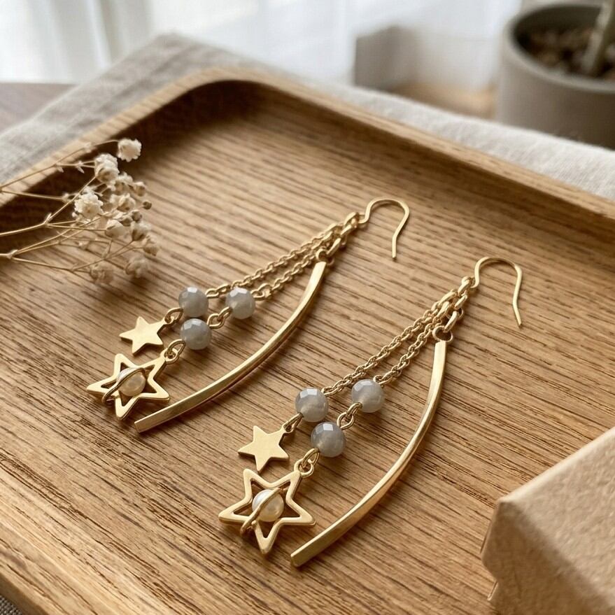 このアイテムは、柔らかなオフホワイトのボタンカットガラスビーズが特長で、清楚さを保ちながらも上品な雰囲気を演出するデザインです。立体的なスターパールが、さりげない輝きを添え、特別な日や日常のおしゃれにもぴったりな一品となっています。