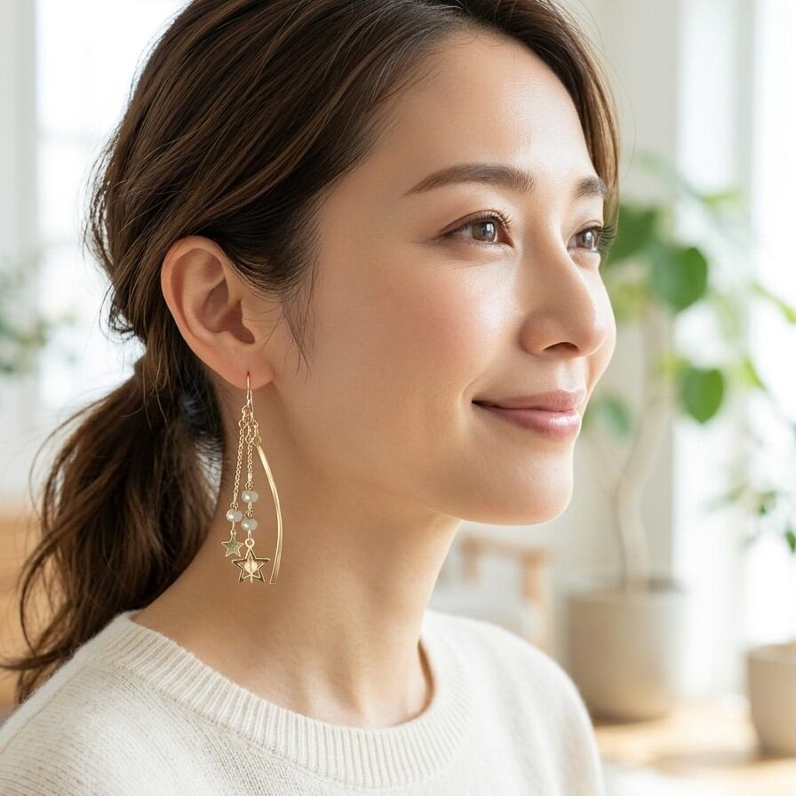 この清楚系のピアスが、あなたの魅力を引き立て、さまざまなシーンでのスタイルに上品さをプラスしてくれるでしょう。軽やかな着け心地にもこだわり、長時間でも快適にお楽しみいただけるアイテムです。